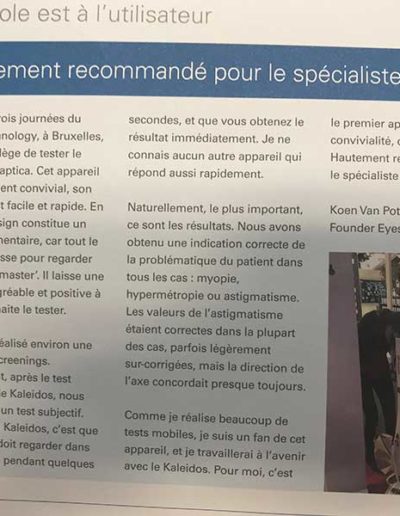“I had the opportunity to test the Kaleidos of Adaptica during the three-day Phamanology exhibition in Brussels. This device is extremely user-friendly, easy and quick to set up. In addition, the design of this device is an additional asset because everyone wants to look in this “viewmaster”. This gives an extra nice and positive feeling for those who want to undergo a test. During these days I did about a hundred screenings. Of course, after the objective test with the Kaleidos, we performed a subjective test. The advantage with the Kaleidos is that the patient only has to look in the device for a few seconds and that you immediately have a result. I do not know any other device where it goes so smoothly. Of course the results are the most important. In all cases we received a correct indication about the patient’s problems; myopia, hypermetropia or astigmatism. The values of astigmatism were correct in most cases, sometimes slightly overcorrected, but the axis direction was correct in almost all cases. Since I carry out a lot of mobile tests, I am a fan of this device and I will work with the Kaleidos in the future. For me this is the first device where user-friendliness, compactness and reliability are present. Highly recommended for the eye specialist”